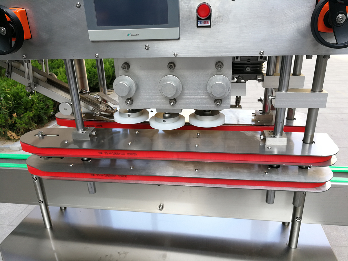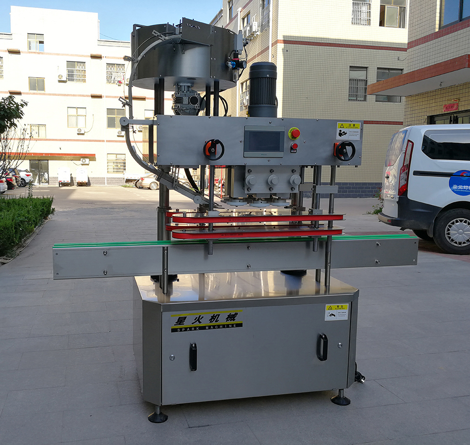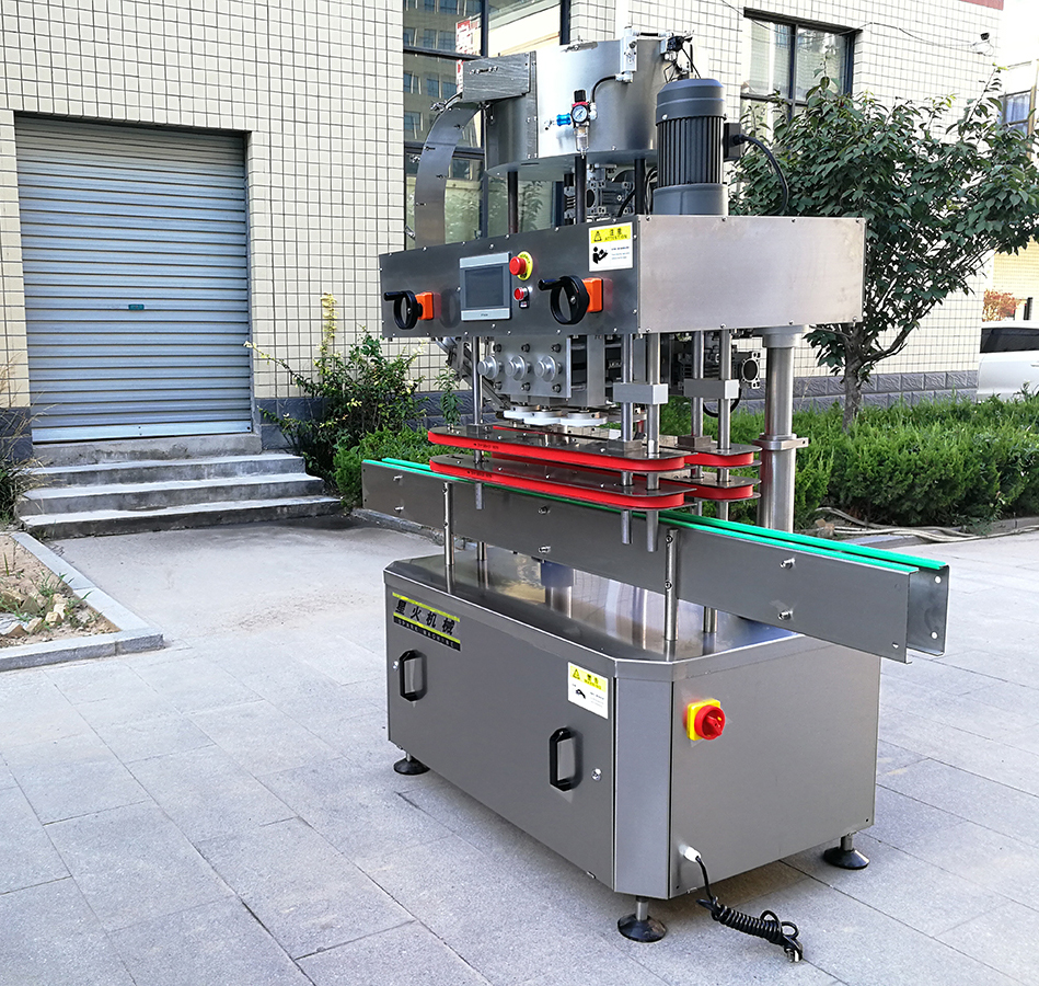 XH-160B型全自動直列式壓蓋機是我公司很新改進的一種新型壓蓋機。四臺調速電機分別用于供蓋、夾瓶、傳送、壓蓋,機器自動化程度高,穩(wěn)定性好,調節(jié)方便、更換瓶型或蓋時無需備件,只需作調整即可完成(如配上蓋機,可進行自動上蓋)。外觀美觀大方、靈巧、壓蓋速度快,合格率高,可適用于食品、醫(yī)用、化工、飲料等行業(yè)的不同瓶形的旋蓋。